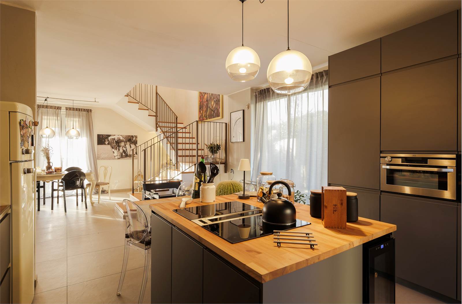 Il piano terra è composto da ingresso sul soggiorno, una cucina parzialmente a vista, bagno finestrato e un ripostiglio a servizio della zona giorno.