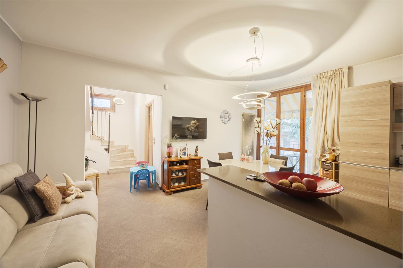 Ingresso in zona giorno con cucina a vista ed ampio balcone, vivibile, servizio con secondo balcone al piano primo; zona notte composta da ampia camera matrimoniale , cameretta e secondo bagno finestrato.