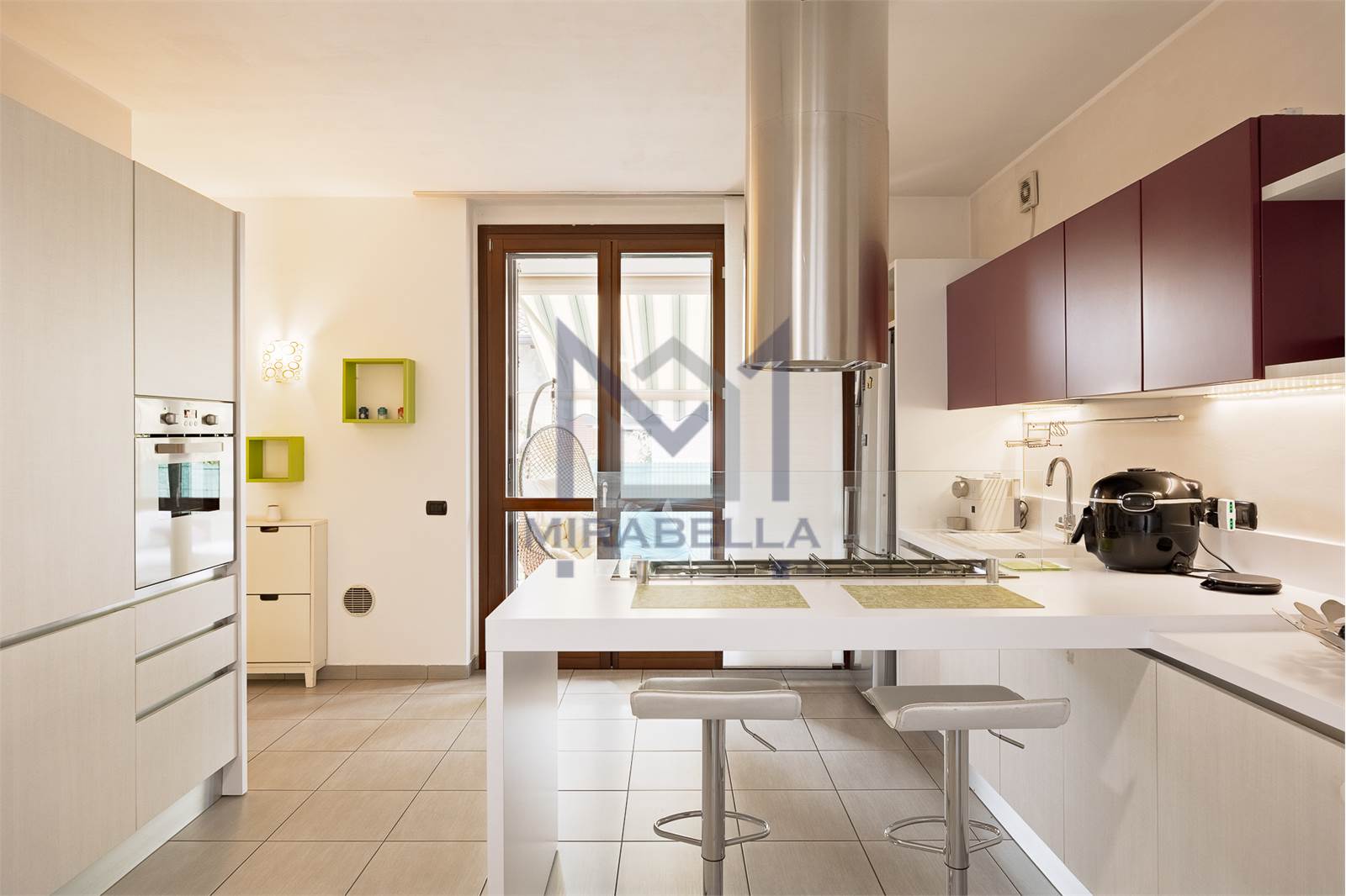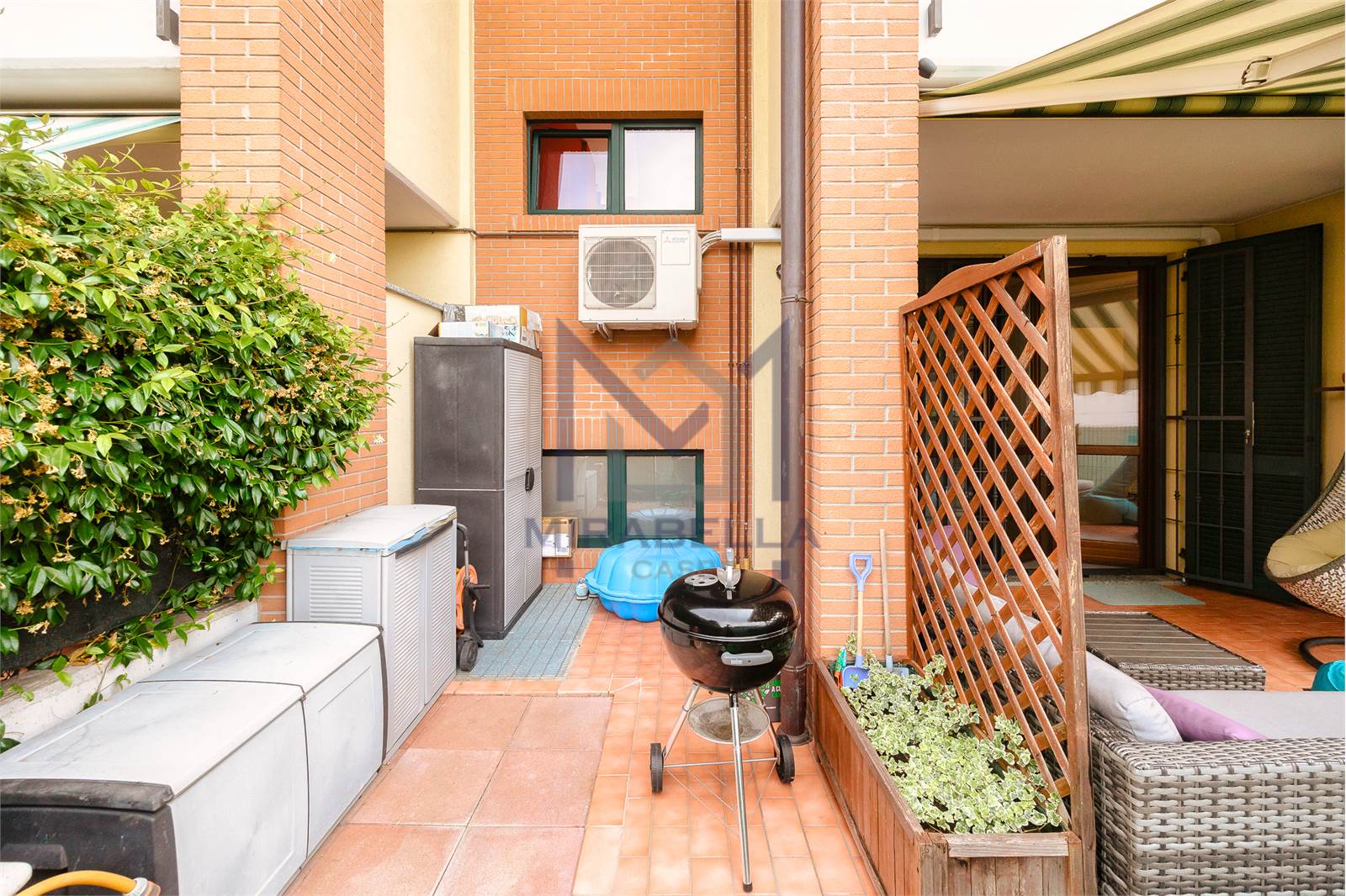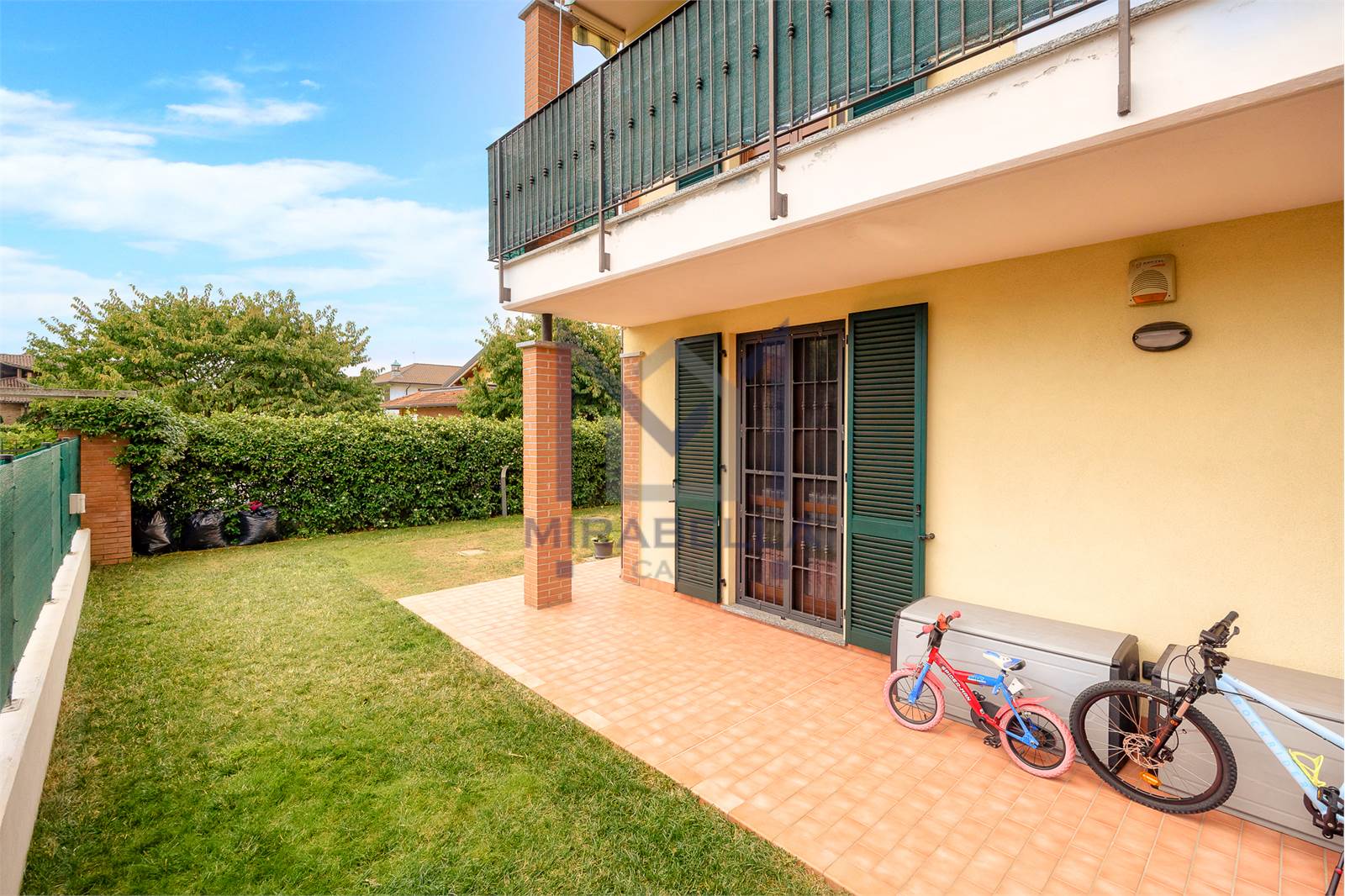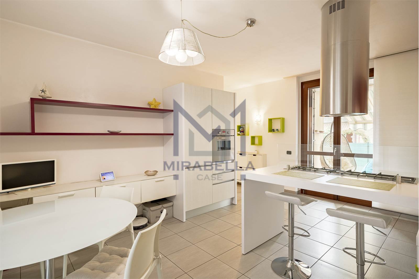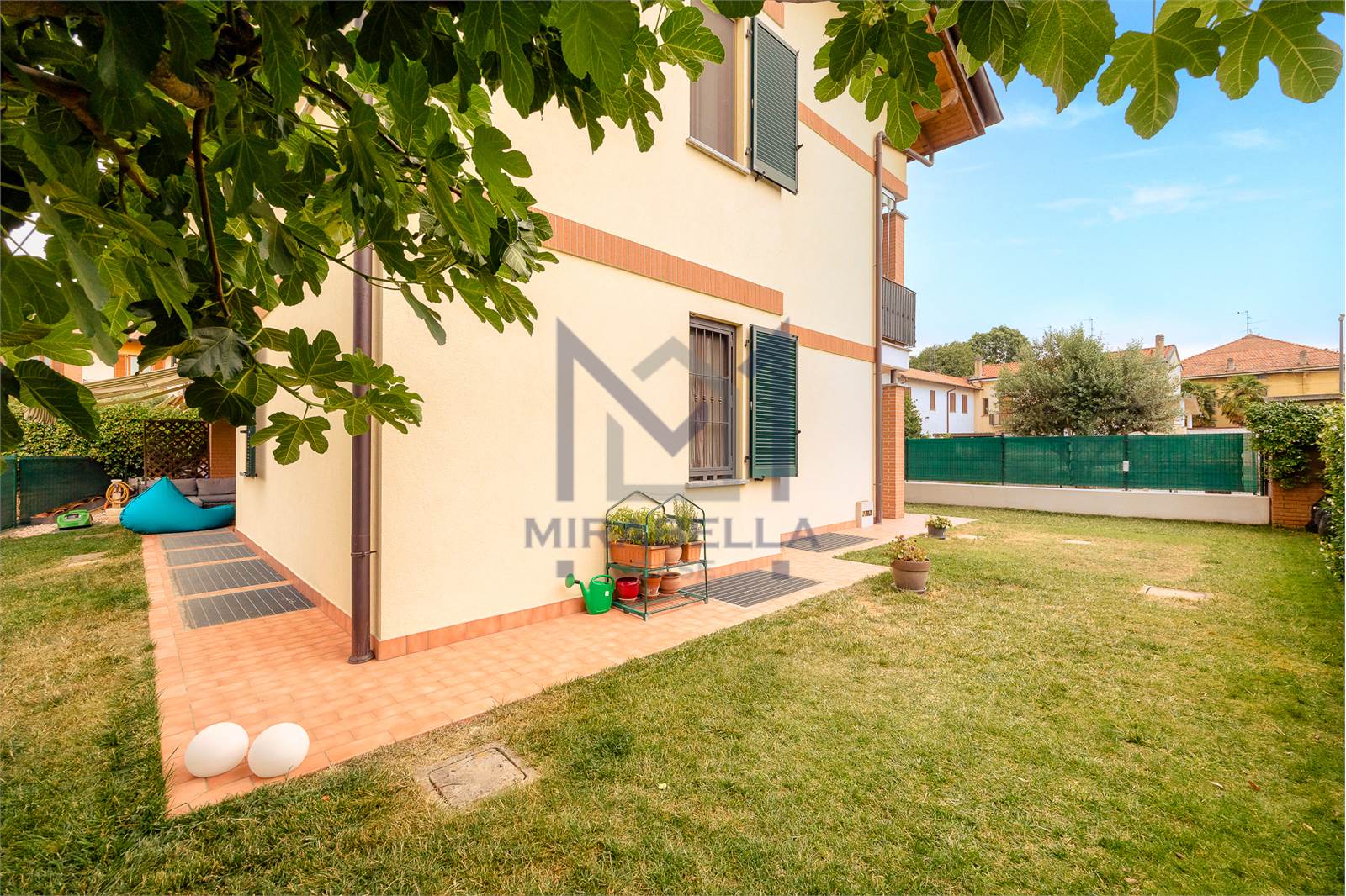 L'appartamento è posto al piano terra ed è così composto: l'ingresso si apre sulla confortevole e luminosa zona giorno (esposta est-ovest) completa di portafinestra che dà accesso allo splendido portico attrezzato con soggiorno esterno ed al giardino di proprietà che abbraccia l'immobile sui 3 lati.