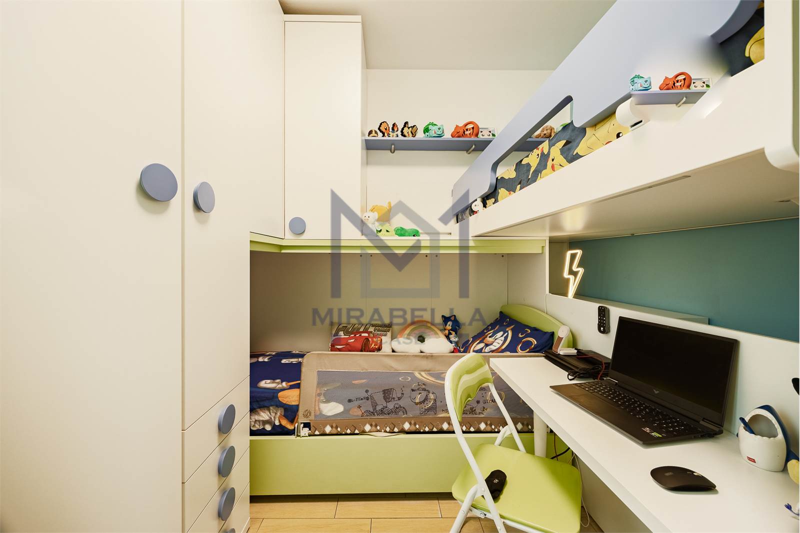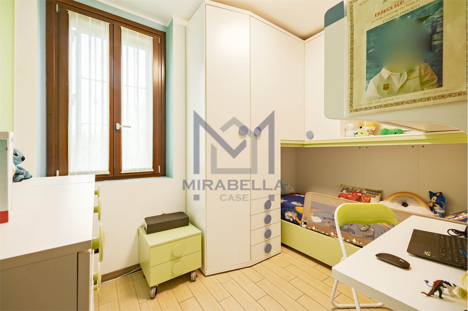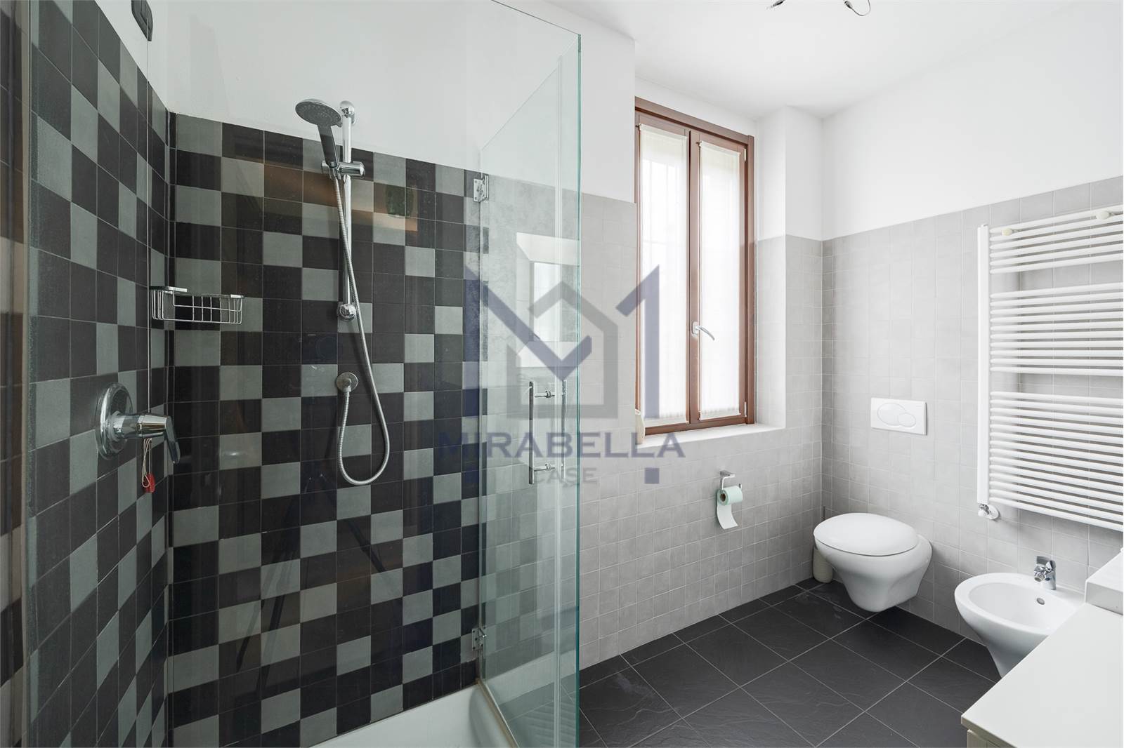 Attraverso un comodo disimpegno si accede alla zona notte dove troviamo un comodo bagno finestrato completo di box doccia e due camere.